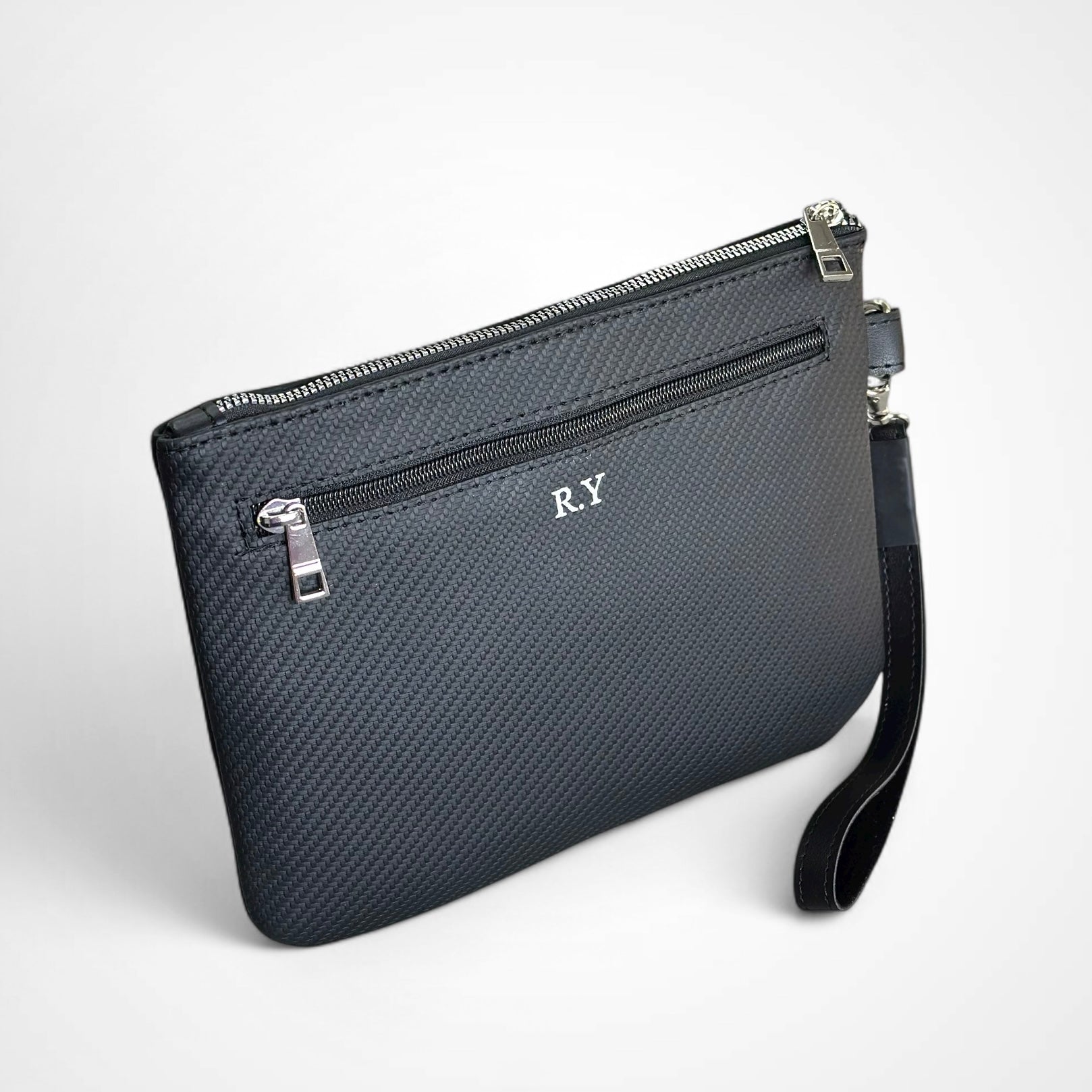 Мъжка чанта от кожа тип “черен карбон” с с опция за инициали .