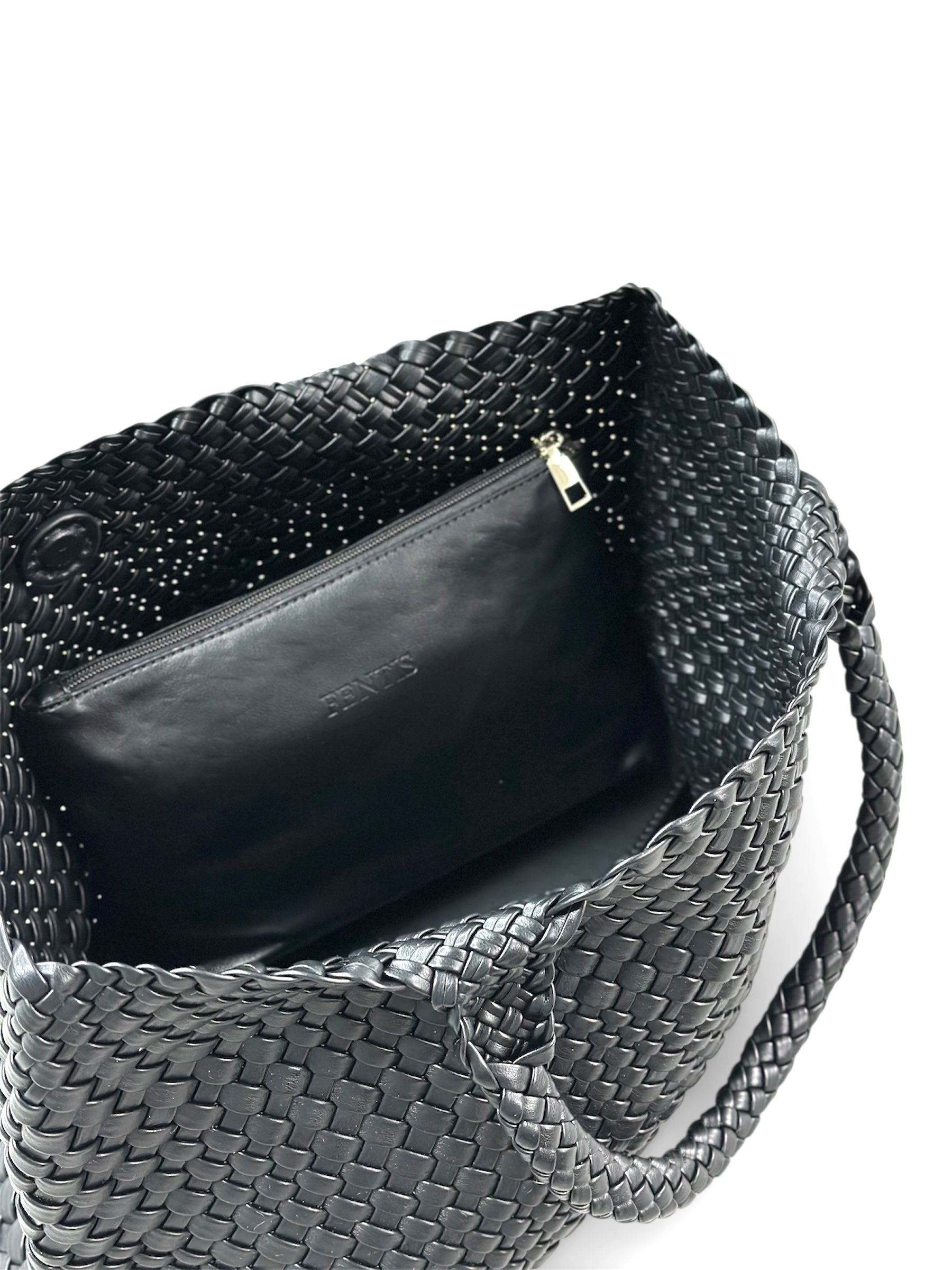 Елегантна плетена чанта с модерен дизайн . Изработена от висококачествен материал с плътна плетка, която придава стилен и премиум вид. Моделът включва отделна малка чантичка, идеална за съхранение на дребни вещи . Подходяща както за ежедневието, така и за по-елегантни визии.