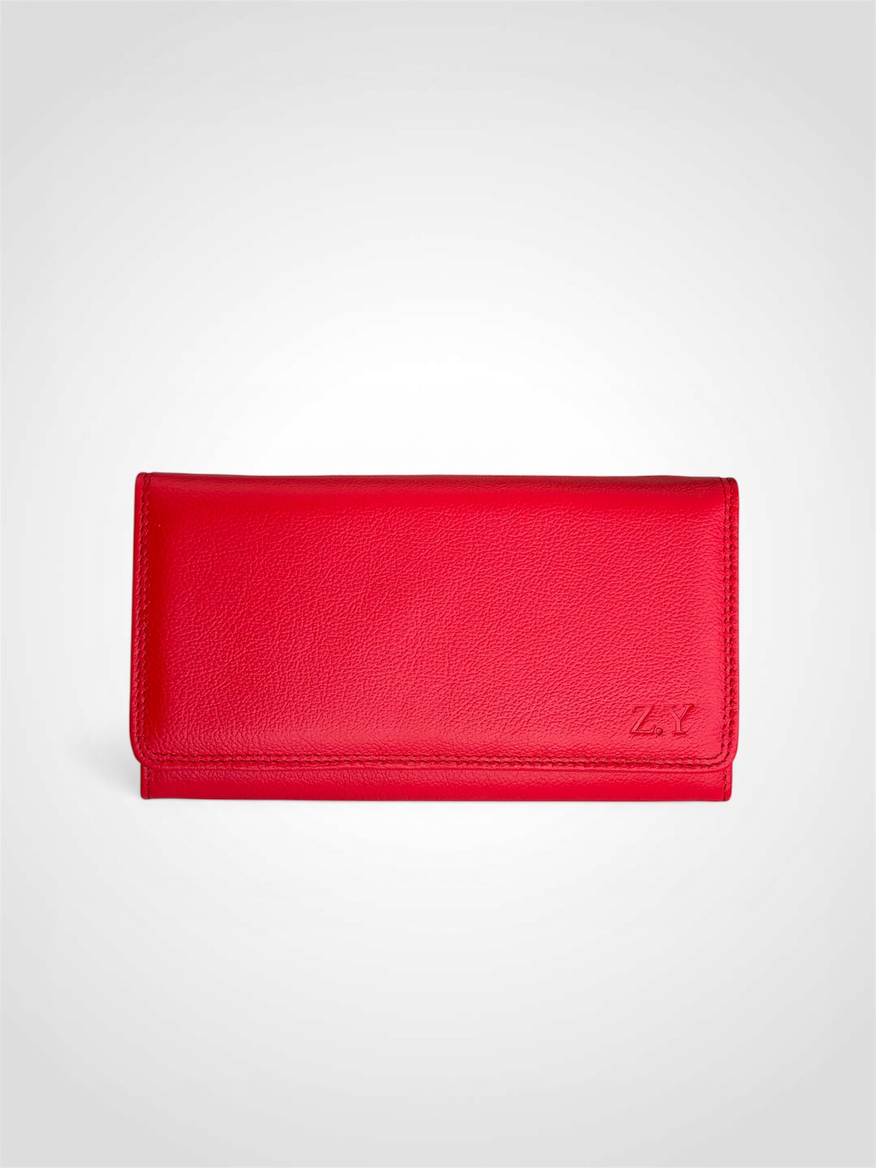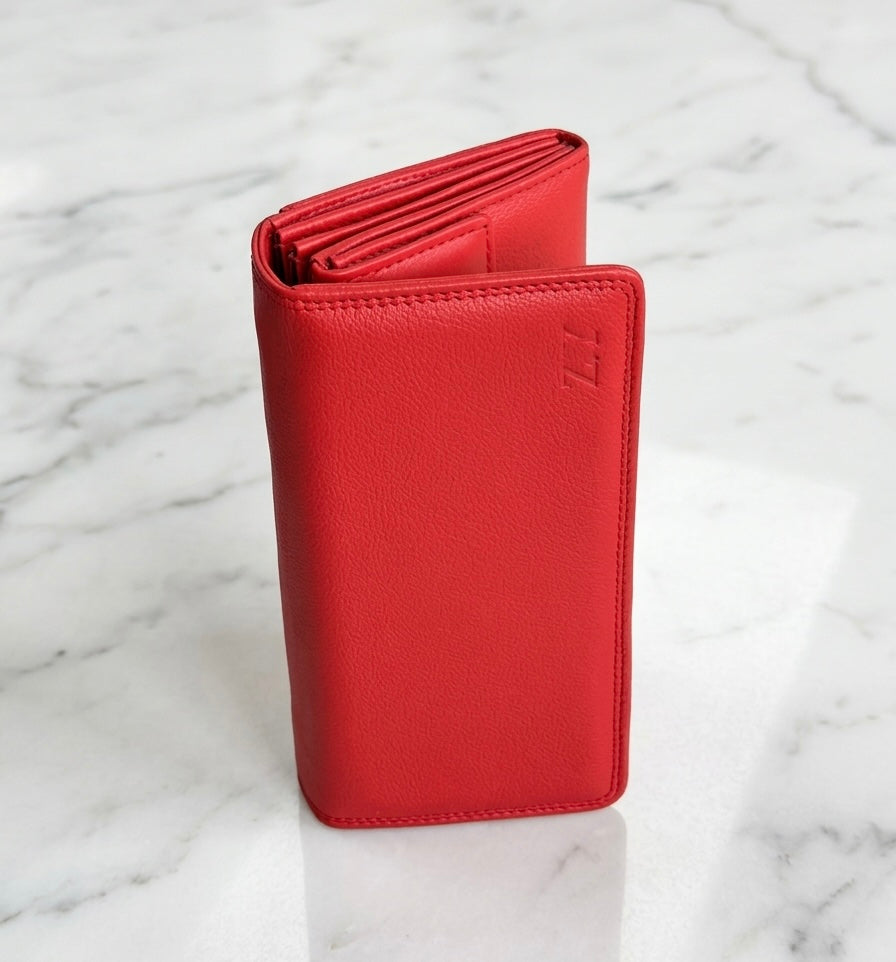 Компактен червен портфейл от естествена кожа с практично разпределение, вътрешен цип и опция за персонализация с инициали.