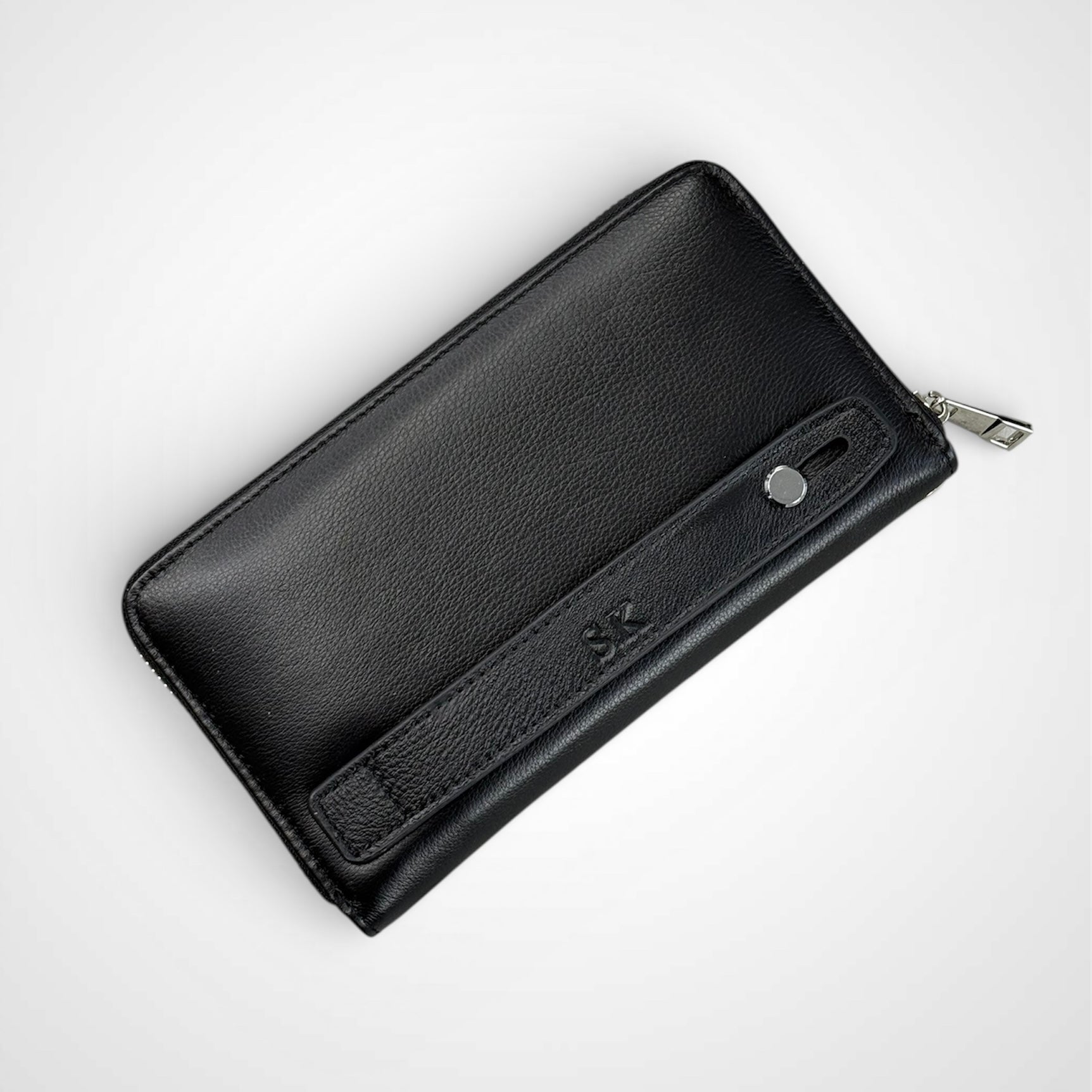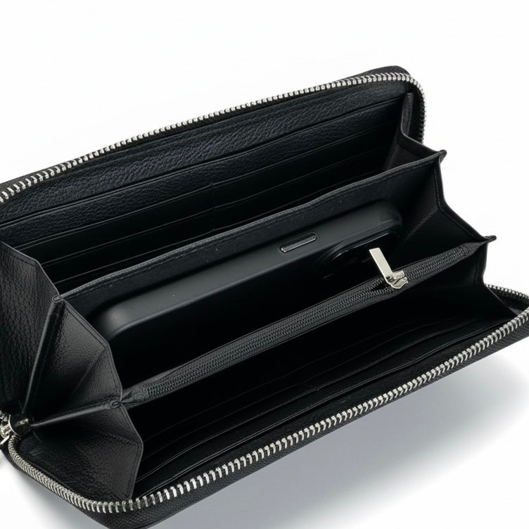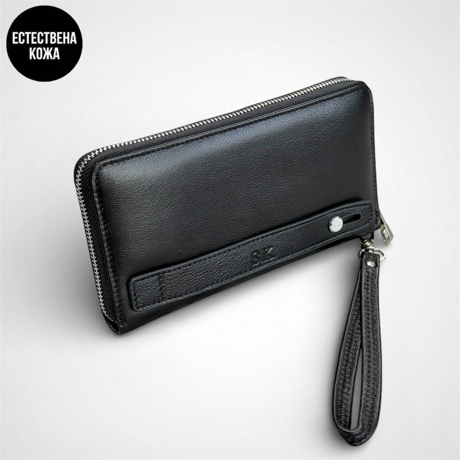 Портмоне от естествена кожа с цип. Практично вътрешно разпределение с отделения за карти, пари и телефон, както и удобна каишка за носене на ръката. Стилен и функционален аксесоар с опция за персонализиране с вавите инициали .